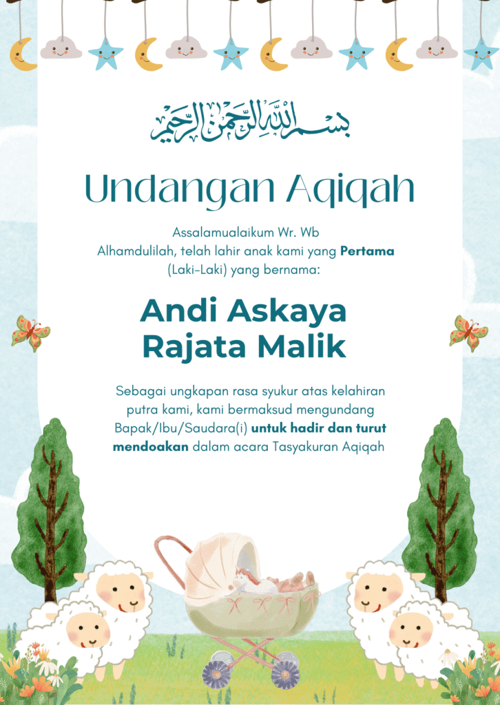 Tanpa mengurangi rasa hormat kami bermaksud mengundang Bapak/Ibu/Saudara/i pada acara Tasyakuran Aqiqah Anak pertama kami: