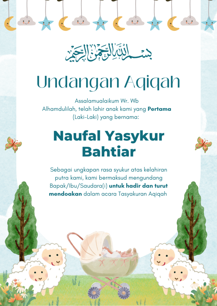 Tanpa mengurangi rasa hormat kami bermaksud mengundang Bapak/Ibu/Saudara/i pada acara Tasyakuran Aqiqah Anak pertama kami: